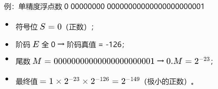 **(1)阶码真值:**固定为 "1 - 偏置值"(单精度偏置值 127,因此真值 = 1 - 127 = -126);