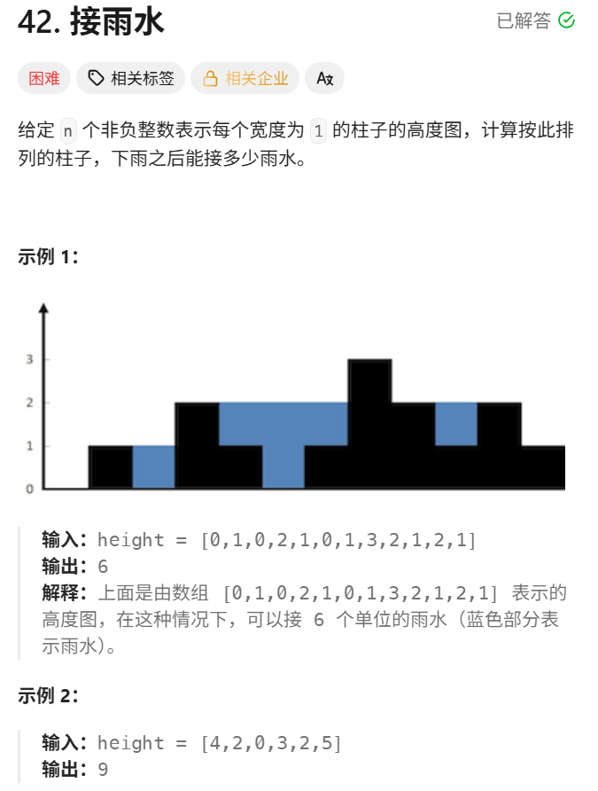 核心思想:一个位置能接多少水,取决于它左边最高和右边最高的柱子中的较矮者,如果知道左边最大值和右边最大值,就能判断当前柱子能接多少水