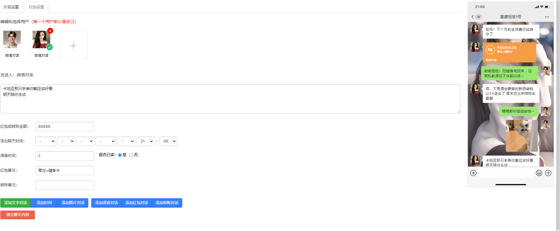 这是一个可以在线生成微信风格聊天截图的工具,支持以下功能: