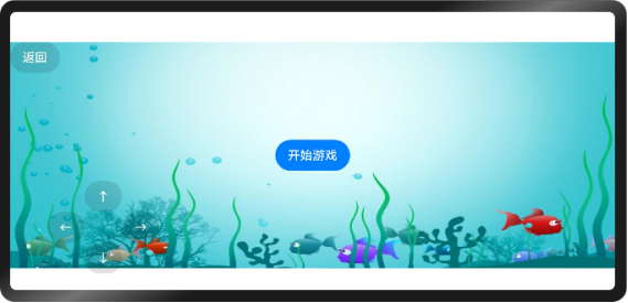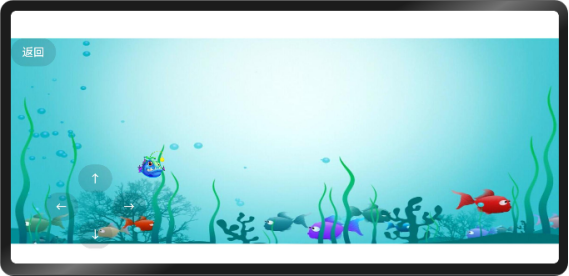 "小鱼游戏"页面是是一个以海洋为主题的游戏页面。画面背景是浅蓝色的海水,左上角有一个写着"返回"的灰色按钮。页面左侧分布着一些操作箭头图标,包括向上、向左、向右和向下箭头,用于控制游戏小鱼角色的移动。