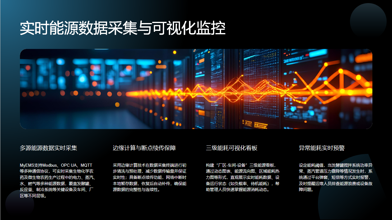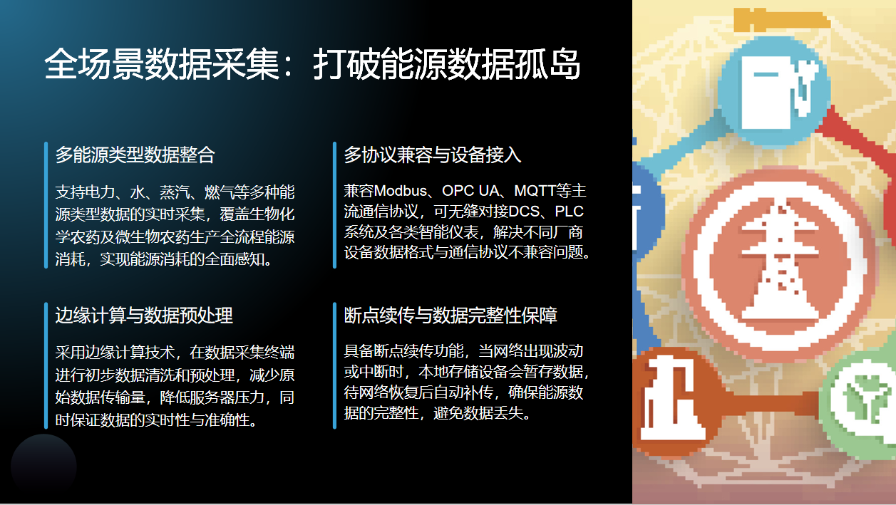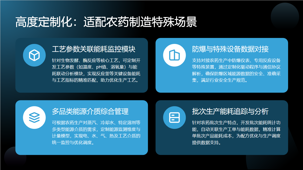 核心功能模块在农药制造场景落地,通过实时能源监控模块构建三级能耗看板,展示高耗能设备能耗数据;多维度分析模块对比不同批次生产能耗差异,结合工艺参数提出优化建议,如调整发酵罐搅拌频率降低能耗。