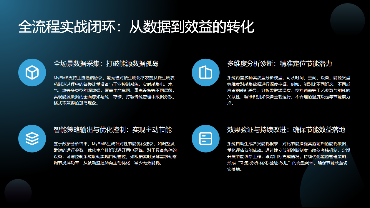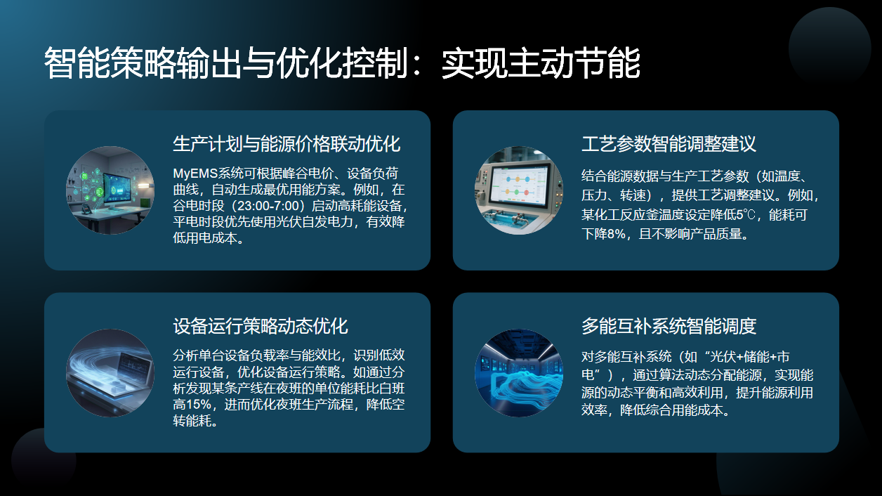 最后是效果验证与持续改进,系统自动生成报表,量化评估节能成效,通过建立制度和机制,持续优化策略,形成完整闭环,确保节能效益切实落地。