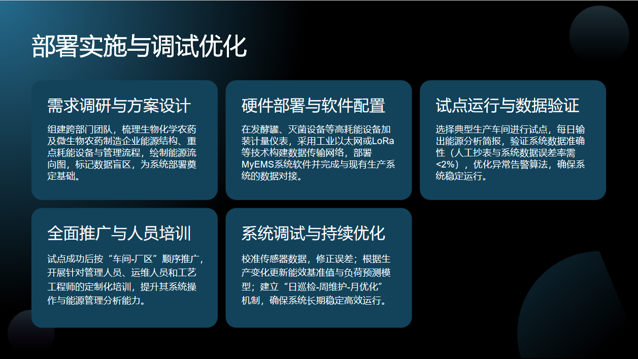 随后开展试点运行与数据验证,选择典型车间试点,输出能源分析简报,确保系统数据误差率小于2%,优化告警算法保障稳定运行。