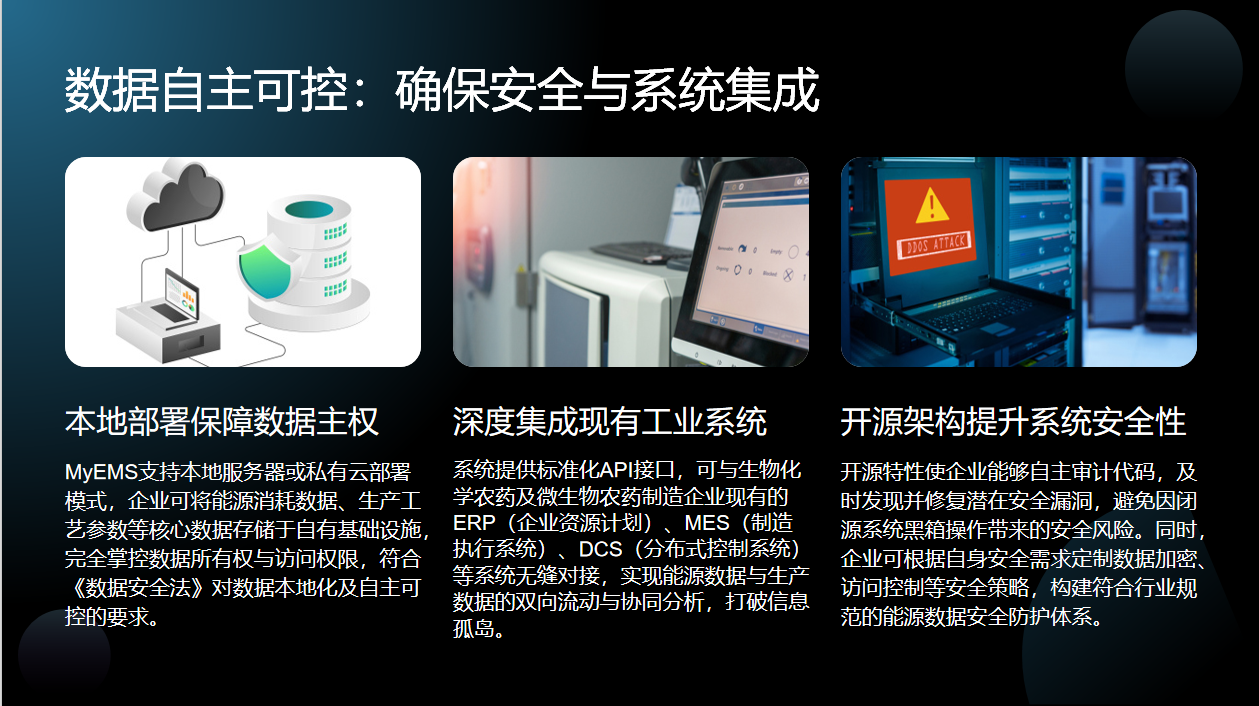 MyEMS在数据自主可控方面表现卓越,为生物化学农药及微生物农药制造企业带来了安全与系统集成的保障。它支持本地服务器或私有云部署,让企业能完全掌控能源消耗等核心数据,既符合数据安全法规,又保障了数据主权。