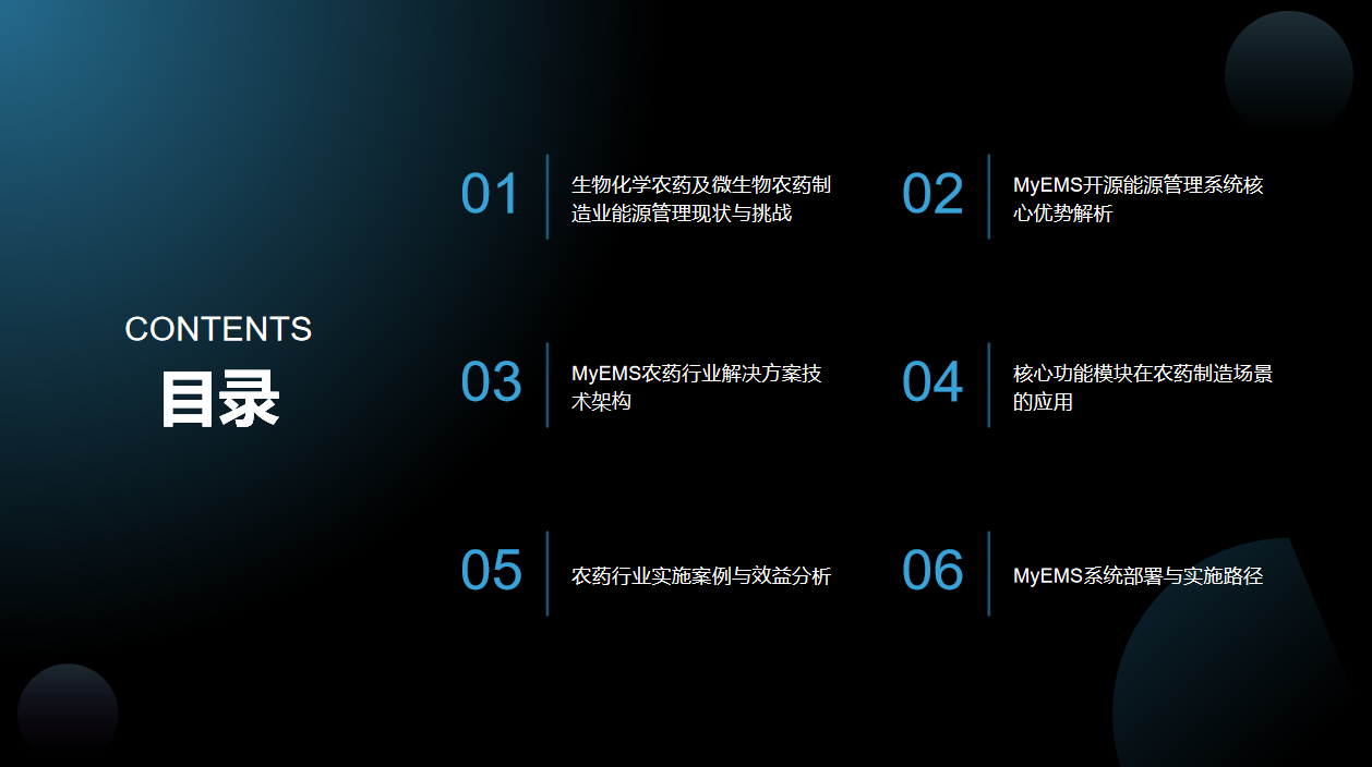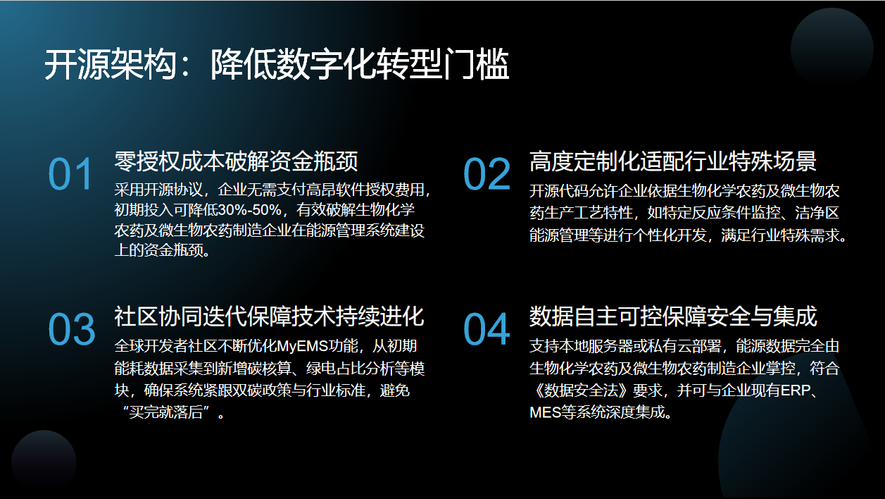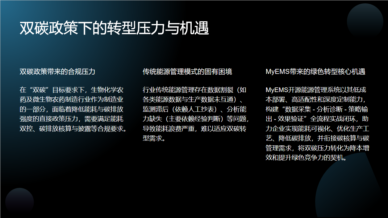 本次演讲将围绕六个方面展开。先剖析生物化学农药及微生物农药制造业能源管理现状与挑战,明确问题所在;接着解析MyEMS开源能源管理系统核心优势,展示解决方案;再介绍其技术架构、功能应用、实施案例,最后说明系统部署与实施路径,助力企业绿色低碳转型。