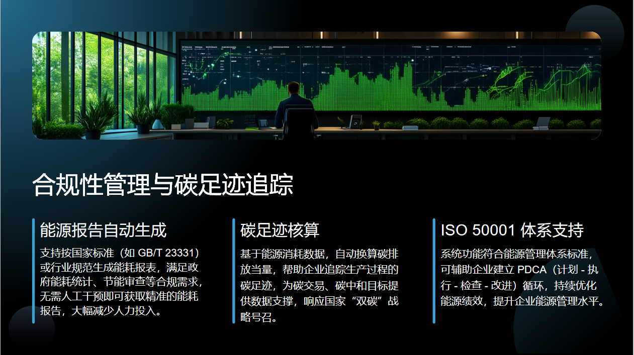 此外,系统功能契合ISO 50001能源管理体系标准,可帮助企业建立计划、执行、检查、改进的循环模式,持续优化能源绩效,提升能源管理水平。
