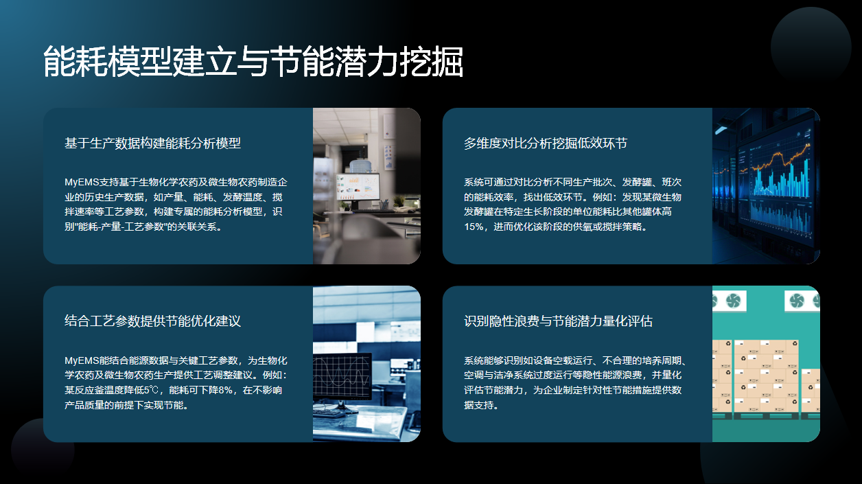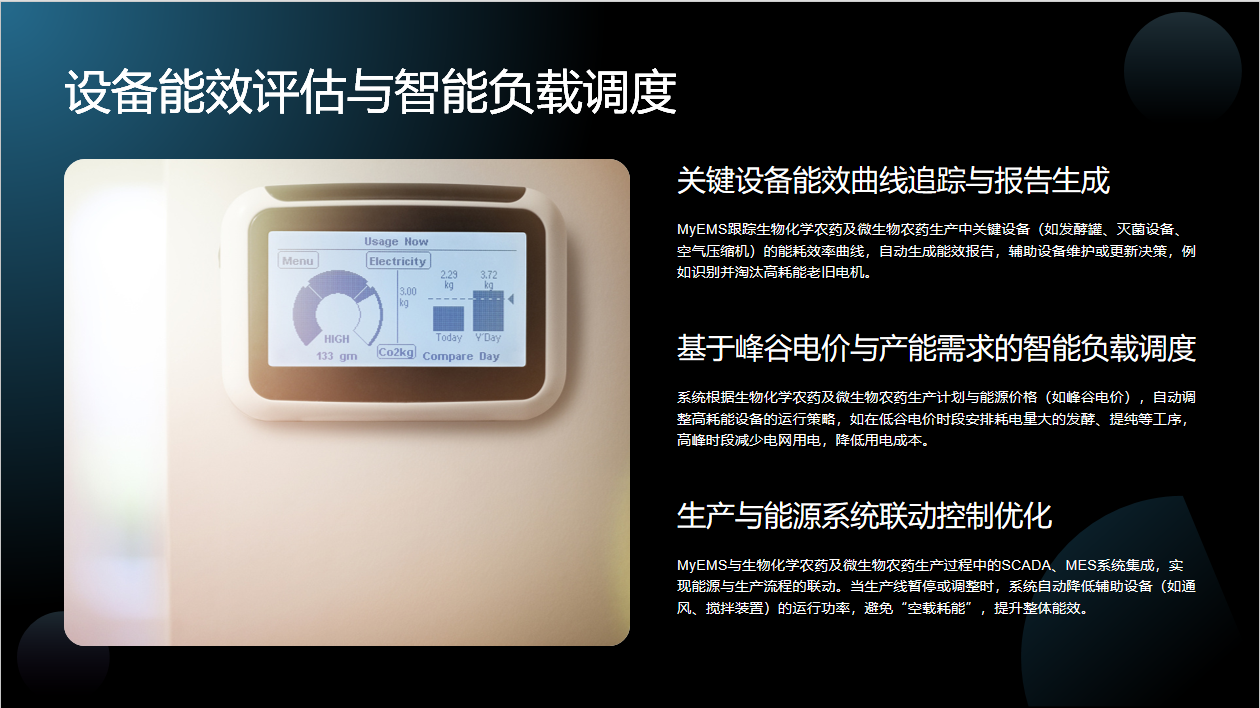 MyEMS在设备能效评估与智能负载调度方面表现出色。一方面,能跟踪生物化学农药及微生物农药生产中关键设备的能耗效率曲线,自动生成能效报告,辅助企业进行设备维护或更新决策,比如识别并淘汰高耗能老旧电机,从设备端挖掘节能潜力。