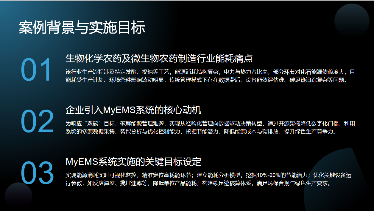 前面我们详细了解了MyEMS系统在农药制造场景中的核心功能,包括数据采集、能耗分析、设备调度等。现在,让我们把目光转向实际应用。本章节将通过农药行业的实施案例,为大家展示该系统带来的节能效益与碳排放降低成果,看看它在实际中如何发挥作用。