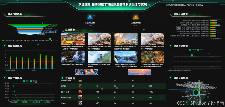 管理员点击"看板"功能后,将进入一个数据可视化界面,直观展示江西旅游的核心业务数据。看板上可查看团游价格、江西景点总数、各景点门票价格、景点热度排名、景点评论数量与趋势、江西旅游攻略总数、热门旅游路线、团游评论情况以及团游的销售数据等。这些数据以图表和数字形式呈现,帮助管理员快速掌握业务动态,为决策提供数据支持。如图5-8所示: