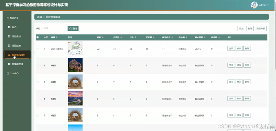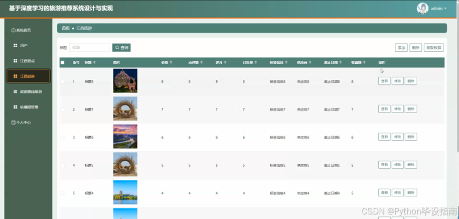 在旅游推荐系统中,管理员点击"江西旅游"功能后,可输入标题进行查询,系统会快速返回相关的江西旅游信息列表,包括旅游攻略、景点介绍、特色活动等内容。管理员可以查看详细信息,对现有内容进行修改或删除,以确保信息的准确性和时效性。管理员还可以通过系统添加新的江西旅游信息,或利用爬取数据功能从外部权威渠道获取最新的旅游资讯,丰富平台内容。如图5-6所示:
