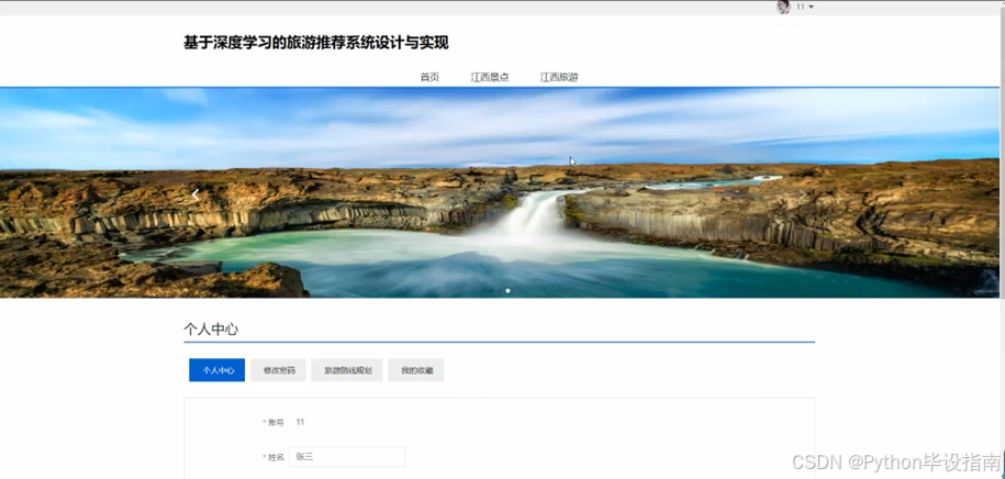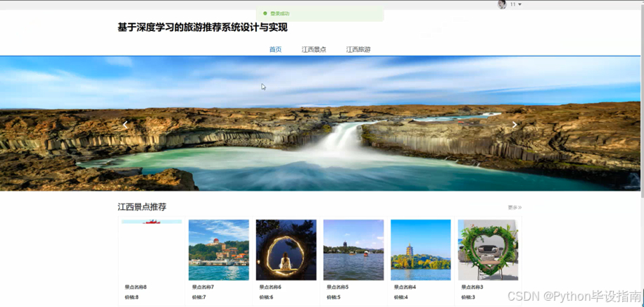 系统首页为用户提供江西旅游的核心信息与便捷入口。其中,"江西景点"模块集中展示江西的热门景点,如庐山、滕王阁等,方便用户快速了解;"江西旅游"提供旅游攻略、推荐线路等综合信息,助力用户规划行程;"个人中心"则是用户管理个人资料、收藏及偏好设置的专属空间,提升个性化体验。系统首页页面如图5-1所示: