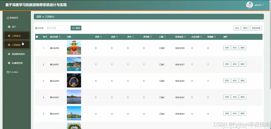 管理员点击"江西景点"功能后,可输入景点名称进行查询,系统会快速返回相关景点信息列表。管理员可在列表中查看景点详情,包括介绍、门票价格、开放时间等。管理员还可以添加新的景点信息,通过爬取数据功能从外部网站自动获取景点数据,或删除不再需要的景点记录。管理员能够修改景点信息,确保数据的准确性和时效性,为用户提供最新的旅游参考。如图5-5所示: