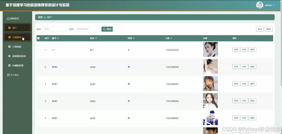 在旅游推荐系统中,管理员点击"用户管理"功能后,可输入用户姓名或性别进行精准查询。查询结果以列表形式展示用户信息,管理员可在此基础上查看用户详情、修改用户信息或删除用户记录。管理员还可通过此功能添加新用户,完善用户信息,确保用户数据的完整性和准确性,从而高效管理用户信息,提升系统管理效率。如图5-4所示: