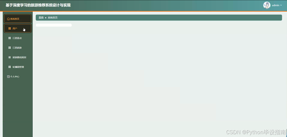 管理员主页面作为系统控制中心,提供全面的管理功能。页面通常详细列出所有管理模块,包括用户、江西景点、江西旅游、旅游路线规划、轮播图管理、个人中心等,确保管理员能够高效地进行日常管理工作。整个页面布局清晰,功能模块化,便于管理员快速定位和操作。管理员主界面如图5-3所示: