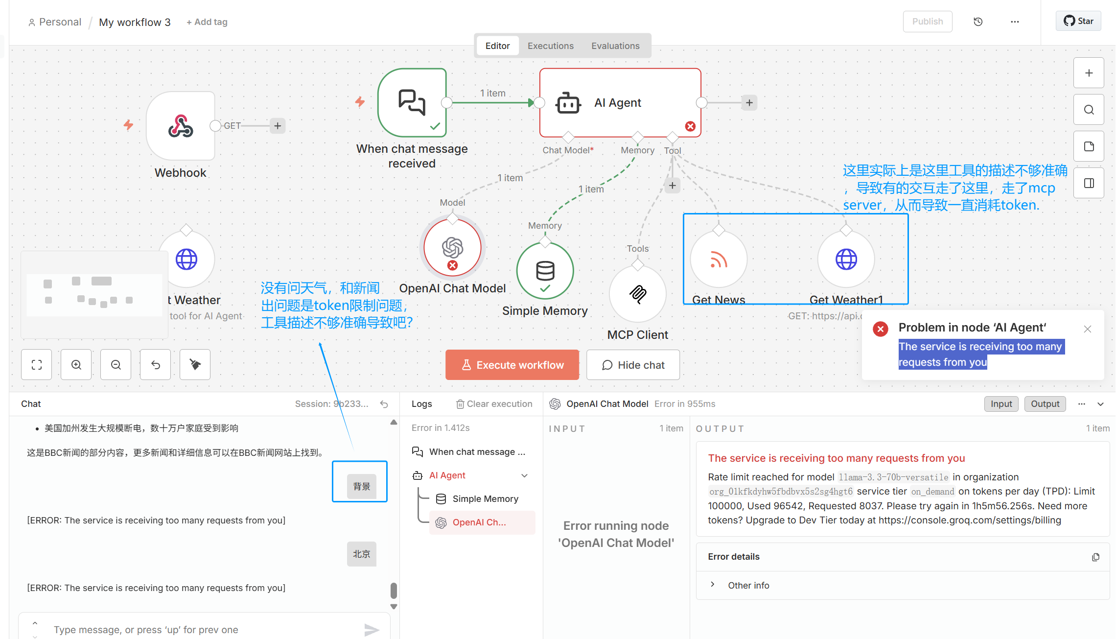 这里仅仅为了测试,使用的groq进行交互,同时它自己的节点也遇到问题,使用chatgpt的节点配置成groq的url进行处理。