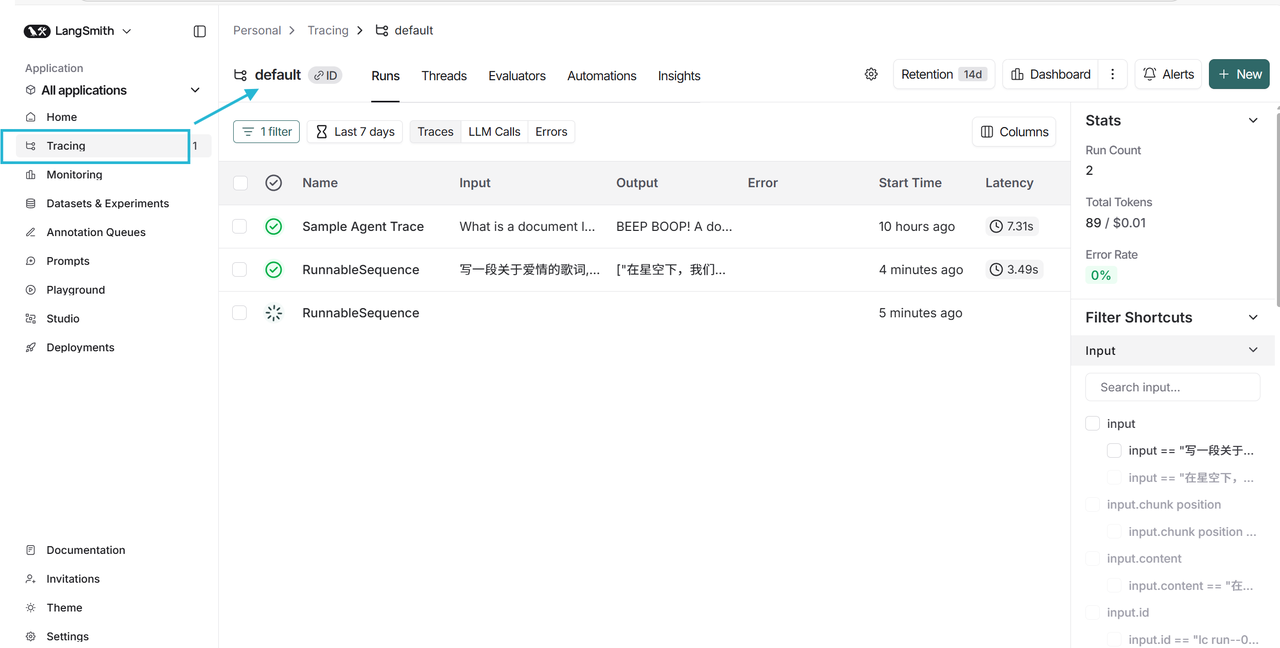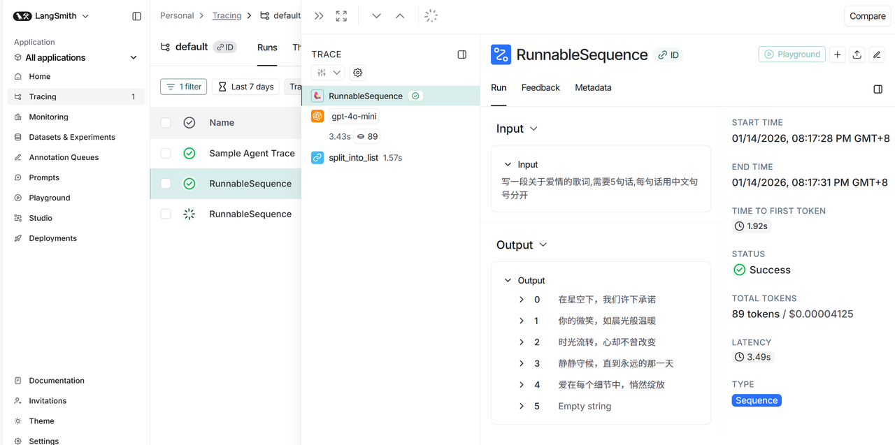 查看 LangSmith 平台,这将在 LangSmith 的默认跟踪项目中生成调用的跟踪。点击最新一次的调用追踪: