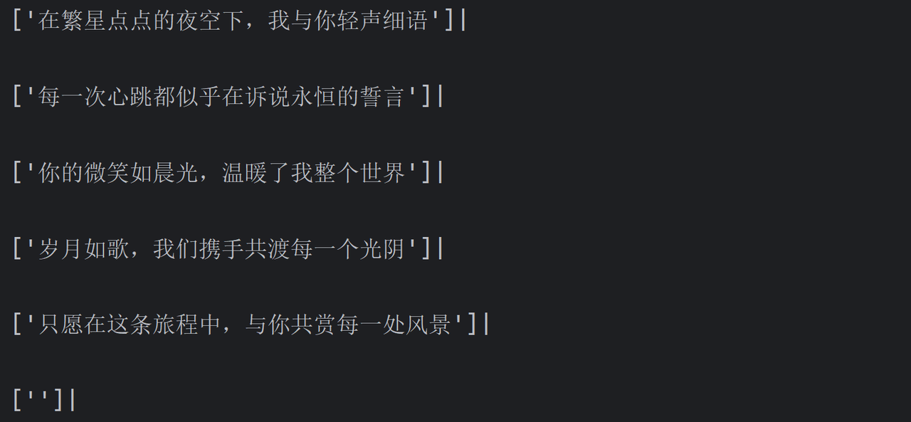 for chunk in chain.stream("写一段关于爱情的歌词,需要5句话,每句话用中文句号分开"):