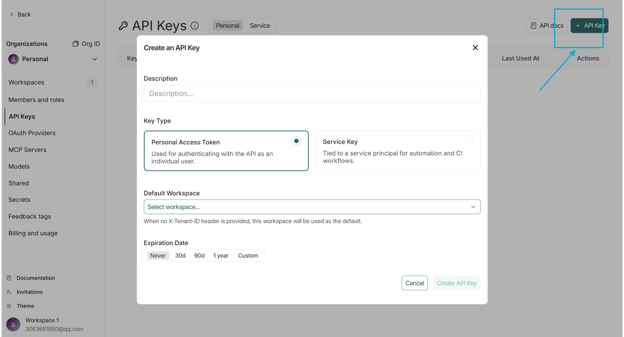 要想让 LangSmith 跟踪 LLM 应用,第一步申请 LangSmith API Key,点击 Settings,就会跳转到"API Keys"设置页面,若没有跳转,可以在左侧 tab 栏中找到进入。