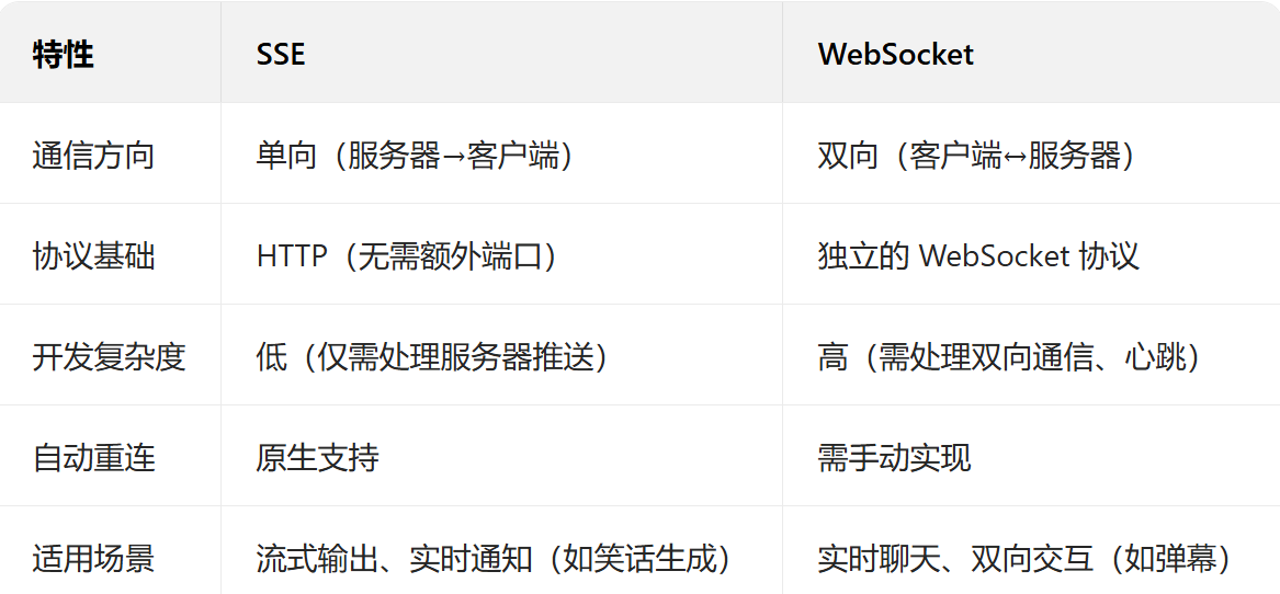 SSE 仅支持服务器向客户端的单向数据推送,客户端通过普通 HTTP 请求简历连接后,服务器可持续发送数据流,但客户端无法通过同一连接向服务器发送数据。
