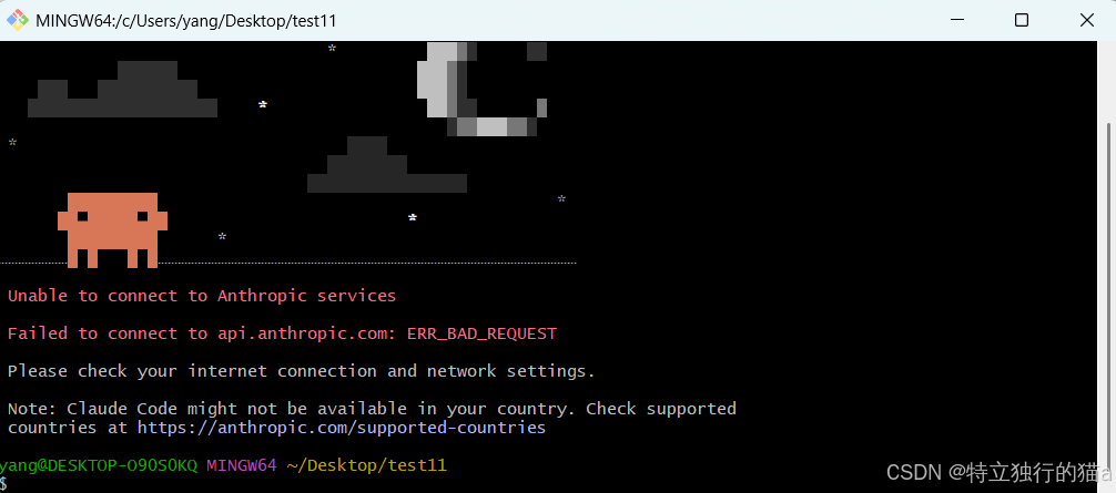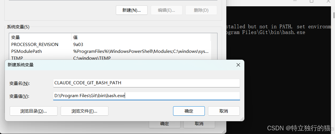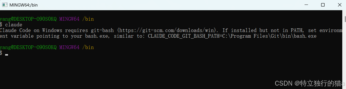 如果报下面这个错,则根据提示把CLAUDE_CODE_GIT_BASH_PATH加入环境变量,值如:D:\Program Files\Git\bin\bash.exe