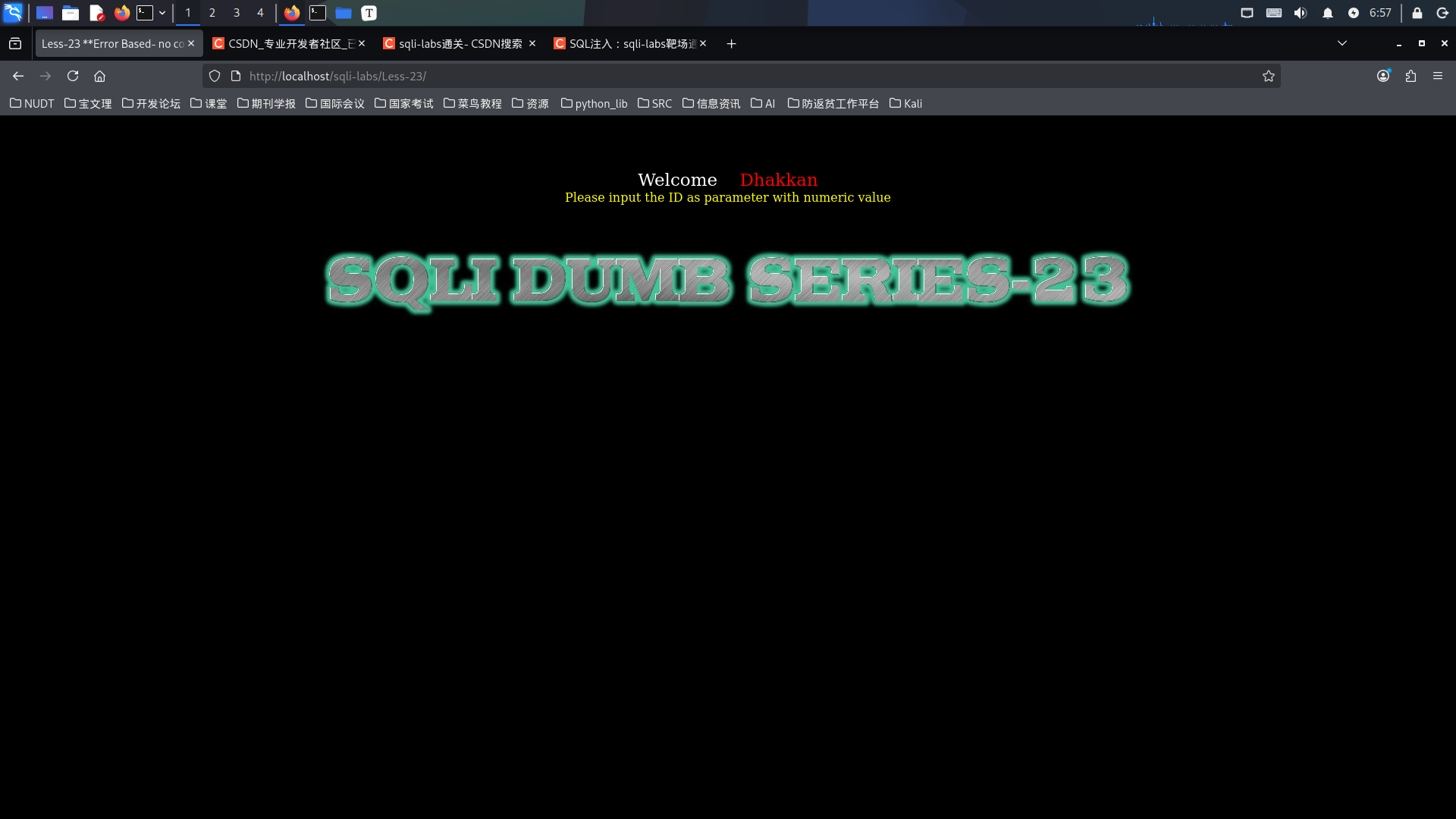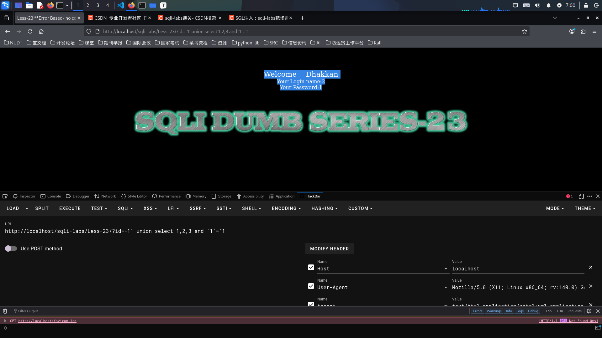 通过分析这条语句,我们可以看出,这条语句由三部分组成,第一部分id='-1',主要作用是让查询数据失效,执行我们想要的第二部分语句,即"union select 1,2,3",这条语句是最主要的查询语句,后续查询数据库与表、列名等数据都是通过修改这条语句实现的。第三部分是'1'='1,主要作用是与原代码中的limit语句相接,使之构成一条完整的SQL查询语句,保持语法的正确。