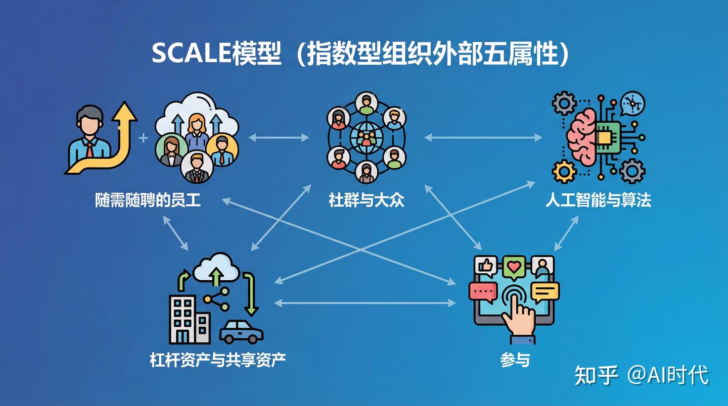 在外部,指数型组织依靠网络协同与智能算法放大能力。全球的自由职业者社群可以被按需调用,算法可以24小时不间断地处理数据并生成决策,共享平台可以让企业以极低的成本获取原本需要巨额投资才能拥有的能力。