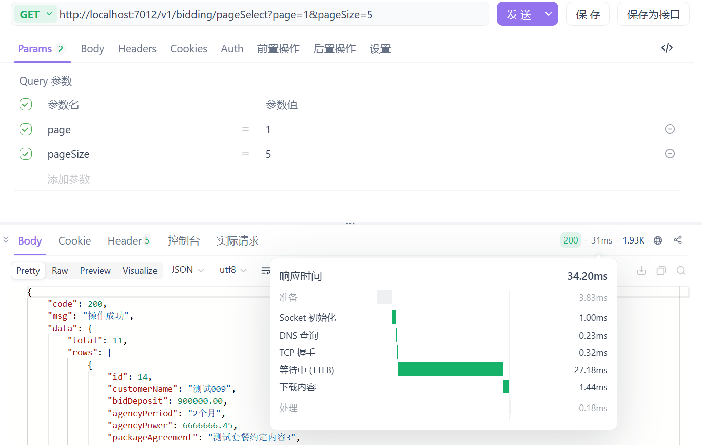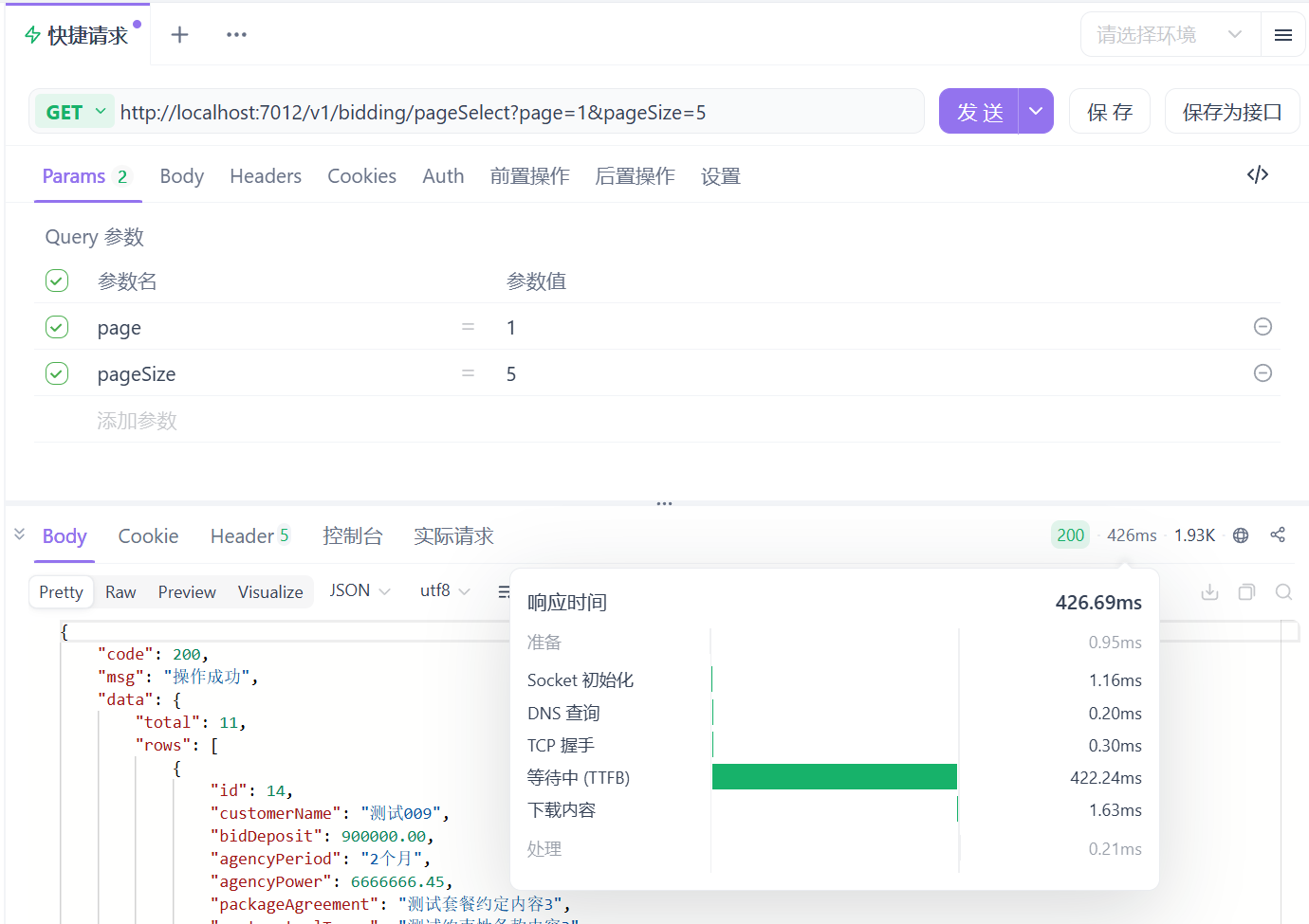 尽管使用插件看起来很方便,但它的性能比较差,PageHelper 默认用法低效执行逻辑SQL查询,PageHelper的核心使用方式是:先执行全量查询,再在内存中做分页,PageHelper 会让 Mybatis 执行 SELECT 字段 FROM 表 → 查询表里的所有数据,把全表数据全部加载到 Java 内存中,然后再做拦截和筛选,这是它效率低的根本原因。可以在apifox上看到响应时间: