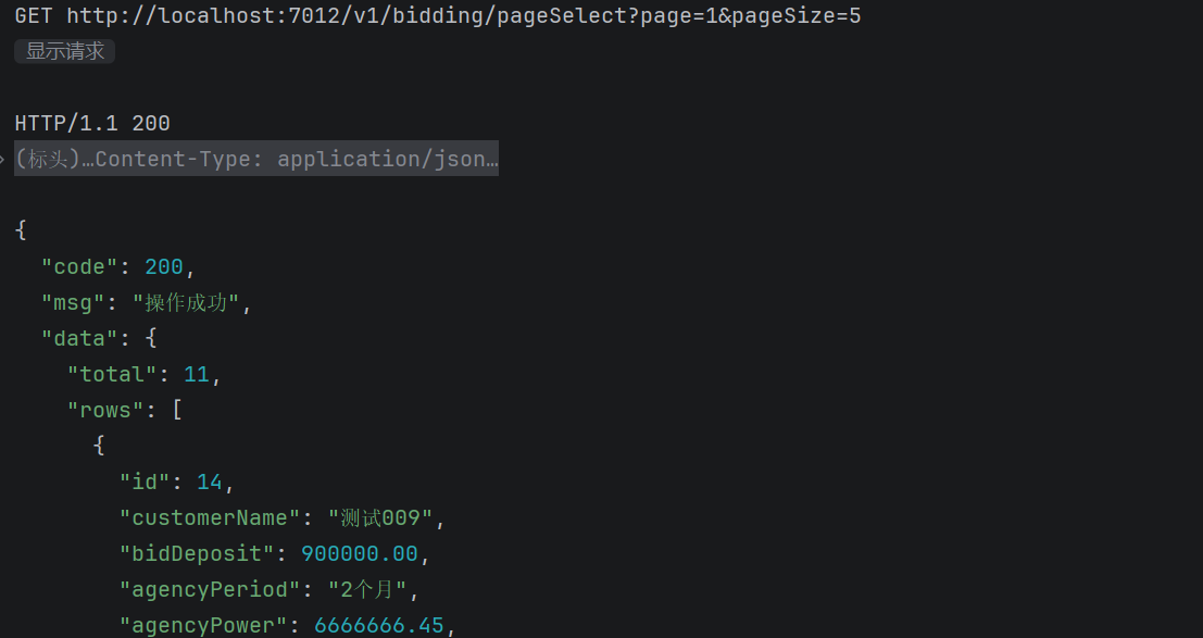 这个rows链表可以通过selectBidding获取,而总数通过getTotal返回。由于数据量可能比较大,id用的是Long类型,所以计算当前记录的行数时要注意数据类型转换。在业务层将需要返回的当页记录链表和总记录数封装在一个PageResult类中,返回给controller层