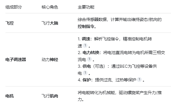 飞控(FlightController)、电机(Motor)和电子调速器(ElectronicSpeedController,ESC)共同构成了无人机的"大脑"与"神经肌肉系统",决定了其稳定性和机动性。下表梳理了它们的核心关系: