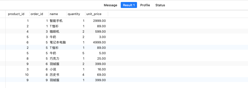 [{"quantity":"1","product_id":"1","name":"智能手机","unit_price":"2999.00"},{"quantity":"1","product_id":"2","name":"T恤衫","unit_price":"89.00"},{"quantity":"2","product_id":"4","name":"咖啡机","unit_price":"599.00"},{"quantity":"2","product_id":"5","name":"牛奶","unit_price":"3.00"},{"quantity":"1","product_id":"6","name":"笔记本电脑","unit_price":"4999.00"}]