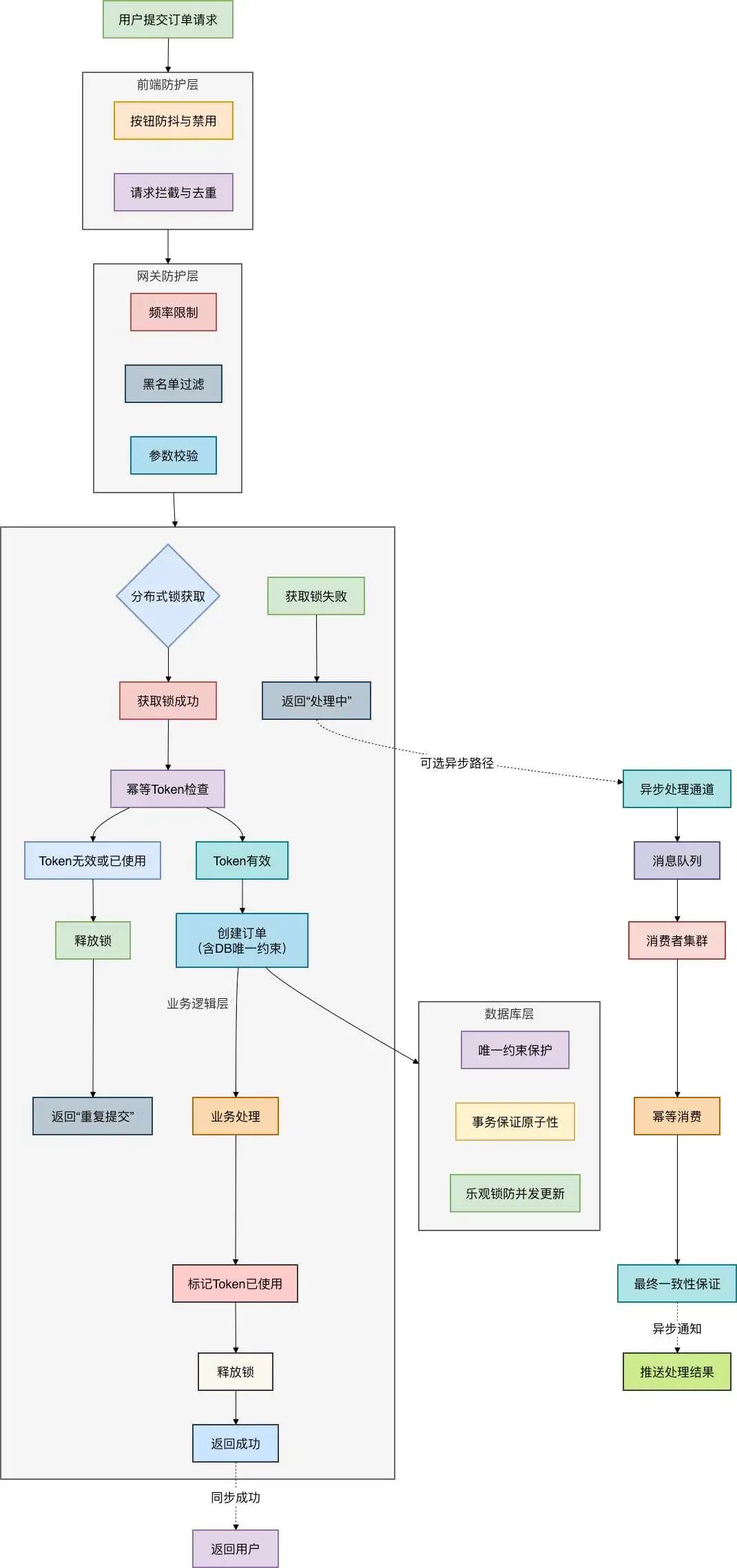 在实际架构设计中,我通常建议采用 "前端防抖 + 网关限流 + Token幂等 + 分布式锁 + 数据库唯一约束" 的综合方案,对于秒杀等极致场景再加入异步处理。