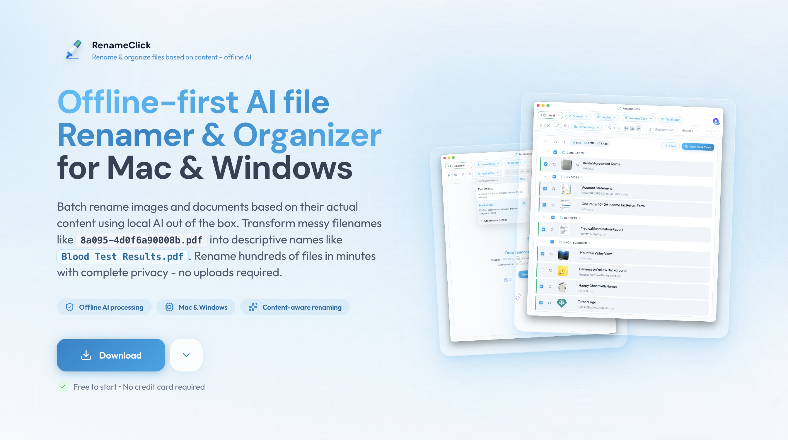 关键词:文件重命名, 离线AI, 文件自动整理, 批量处理, 自定义预设, 多语言支持, Mac/Windows, 本地分析, 文件分类, 清晰名称