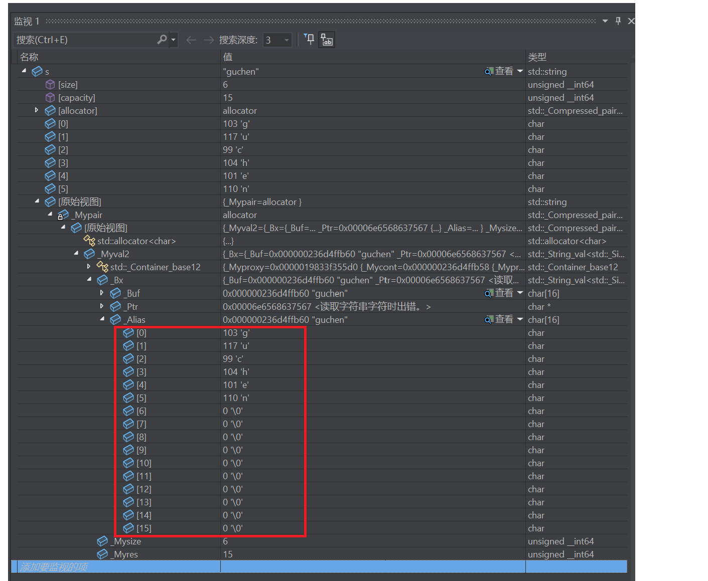cout << sizeof(str3) << endl;//输出5,和编码有关,ascii码不足以表示汉字,unicode编码,一个汉字两个字节,2^16-1=66535,足以表示常见的汉字(utf8,还有utf16 ,utf32等,还有gbk编码,很多生僻词包括的比较全,编码表,也就是值和符号的映射对应关系表)