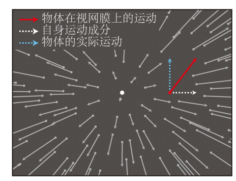 一些研究利用光流来模拟观察者在三维空间中沿着直线前行的视觉输入,结果发现观察者可以通过定位光流延伸焦点的位置来判断自身运动方向(Warren,1976),而且在理想条件下只存在1°到2°的误差(Crowell和Banks,1996)。