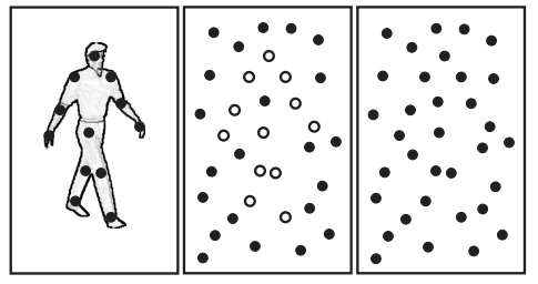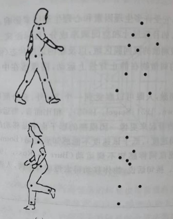 Johansson(1973)开创性的利用光点动画技术将生物体运动模式从形状特征中分离出来。该技术在人体的一些重要关节上贴上信号灯,当该人体在黑暗背景运动时便可得到黑色背景下的亮点活动,从而记录这些关节的运动轨迹。在实验中,观察者仅通过这些亮点活动就能识别出人的运动。如图14,上列图案分别表示步行的外型轮廓(左边)及其光点布局(右边),下列图案表示跑步的。在实验中即便演员只迈出一两步(被试只能看到光点),被试也能正确的识别到这它们。