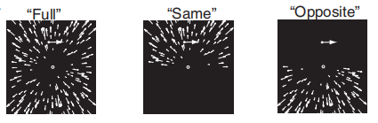 光流模式也与头部和眼睛的转向有关。以直线运动为例,当头部保持注视前方时,延伸焦点处于视觉的正前方;当头部方向不在正前方且延伸焦点仍然在视觉之中时(如头转向45度),所有的光流仍然会从延伸焦点放射而出,但此时延伸焦点已不处于视觉中央处;当在行驶的车辆上看着侧窗时(头转向90度),延伸焦点不在视觉之中。