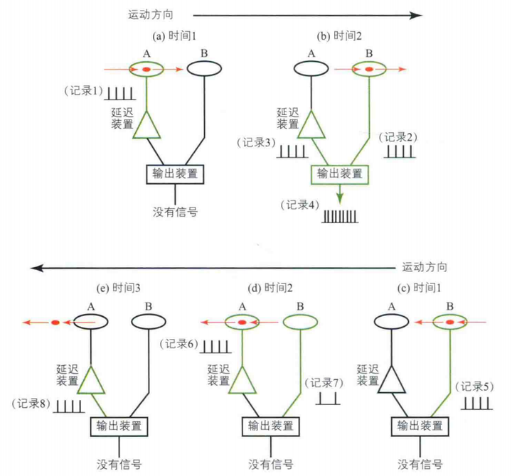 Reichardt(1969)提出了用于运动检测的神经回路,被称为赖卡特探测器。它可以用于解释如何检测特定运动方向和特定运动速度的神经机制,借助图1理解它。这个赖卡特探测由A、B两个感受器神经元(它们分别拥有各自的感受野)、一个延时装置和一个输出装置构成。一个物体从视野中沿着一个特定方向运动,当它经过了A的感受野时,A神经元便会放电产生一个输出信号,这个A的信号会经过延时装置并被延时输出。当物体继续运动到B的感受野时,便会使B放电产生输出信号。输出装置的激活条件是,同时接受到A和B的输出信号。如果这时A的延时信号和B的信号同时到达输出装置,输出装置会被激活产生放电。反之,如果A和B的其中一个先到达而另外一个后到达,输出装置就无法被激活。
