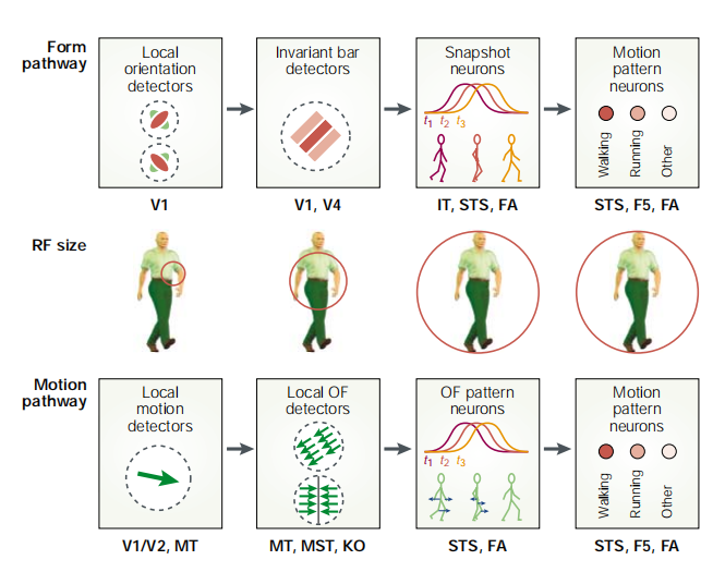 在运动通路,第一层由V1区的方向选择神经元和中颞区(MT)的运动选择神经元构成,它们只对小范围(其感受野范围)的光流反应。第二层对更大范围的光流反应,包括区域和边缘两种光流检测器,其对应区域包括MT区、枕叶运动区(KO)和MST区。第三层的神经元对单个时刻的某种复杂光流模式反应。或者说,对单个时刻的生物运动光流模式反应。它可能位于STS区和FA区。第四层与形状通路的第四层类似,它整合各个时刻的复杂光流模式,并判断是否属于某种生物运动。它可能位于STS区、FA区和前运动皮层的F5区。