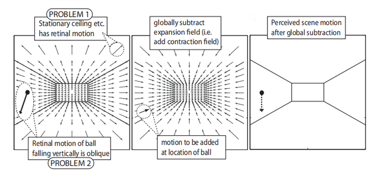 当全局视神经流和局部干扰同时出现时,如何正确的识别正在运动的客体呢?Gibson(1954)认为,不符合自身运动所产生的全局视神经流的那么部分光流,可以被认为是由客体运动所产生的。Rushton和Warren(2005)认为,大脑通过对光流模式的自动分析,可以从中得出由自身运动所产生的全局视神经流成分,该成分随后被视觉系统从整个光流模式中自动的摘除,而摘除后所剩下的成分就是客体运动所产生的局部干扰。该理论被称为流分解假说。以下图8为例,图(a)展示了一个观察者沿着走廊向前走的光流模式,与此同时有一个小球垂直下落。对于小球的光流(后两者的矢量和),除了有一个垂直向下的分量(该分量由小球自身运动产生,如图(c)),还有一个从前往后的分量(由观察者行走所产生的全局视神经流提供)。为了能正确的感知到小球的运动,大脑需要用视网膜所感应到的光流模式减去全局视神经流(即用图(a)减去图(b)),最后我们才能将小球感知为垂直下落(图(c))。再次提醒的是,小球在视网膜的像除了有一个垂直下落分量,还会有一个向着观察者方向的分量。但这并不是观察者所知觉到的。换句话说,视网膜的光流模式并不一定是观察者所知觉的运动模式。在经过流分解后,只有小球的垂直下落运动被观察者知觉到。