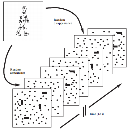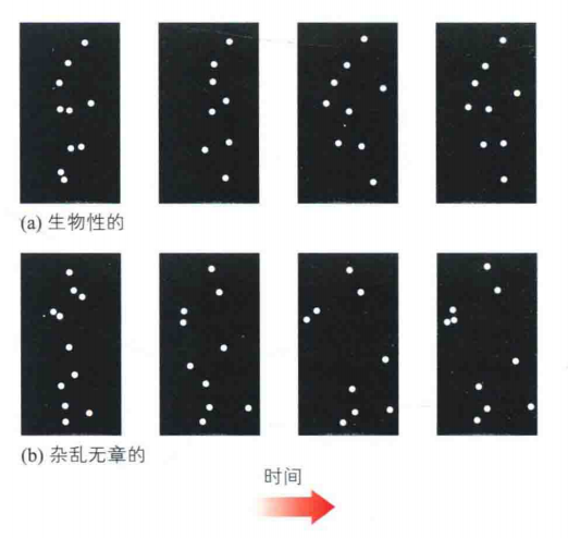 Grossman和Black(2001)让被试观察两类光点动画序列,一类由真实步行运动构成,如图15(a);另外一类是与步行运动类似的、但是无法辨认的和杂乱无章的光点运动,如图(b)。研究发现比起第二类光点运动,第一类能引起颞上沟(STS)更大的活动,因此表明该区域负责对生物活动的识别。随着光点动画技术的日渐成熟,它以成为研究生物运动的有效工具。
