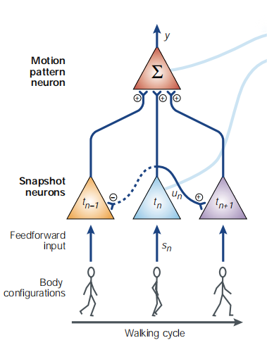 正如电影的每帧需要按照顺序才能播放出连贯的画面。在两个通路的第四层,只有当每个快照神经元以"正确"的时间顺序被激活时,动作才会被识别出来。研究者使用了一种"不对称横向连接"来解决这种序列性。即当一个快照神经元被激活时(形状通路的或者运动通路的),会预激发下一时刻的快照神经元,并抑制其他时刻的快照神经元,如图18。然后,运动检测神经元会按照时间累计各个时刻的快照,最终将这些快照整合为一个动作,如上所述的动作模板一样。