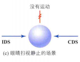那么伴随放电理论是如何解释这些现象呢?图像在视网膜上的位移被称为图像位移信号(IDS);眼动的信号被称为伴随放电信号(CDS),它是大脑控制眼动的控制信号;另外,在该理论中还有一个比较器,如图11。比较器的作用在于,比较IDS和CDS的发生情况。当只接收到其中一个信号时,能检测到运动。而如果同时接收到两个信号或者两个信号都不存在时,不能检测到运动。结合上例,当视觉检测到运动(即有IDS),而眼睛没动(即无CDS)时,即只有一个信号被比较器接收到,因此能检测到运动,对应情况1(图(a));当眼睛跟随物体运动时,即没有IDS但有CDS时,能检测到运动,对应情况2(图(b));当眼睛环视环境,比较器同时接受到IDS和CDS,不能感知到运动,对应情况3(图(c))。