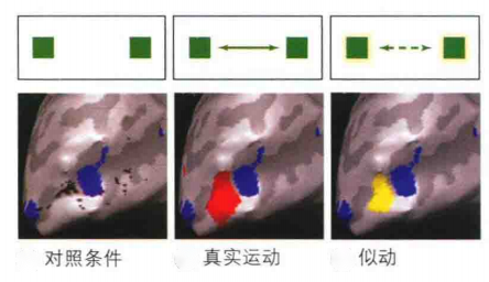 感知运动有两种方式,一种就是通过物体的真实运动(光流),如一辆汽车从面前经过。另外一种是似动,指把客观上不连续的位移看成是连续运动的一种现象。它不是由真实运动所产生,而是一种运动错觉。如图12中两个分离的光点,当它们交替闪烁的频率足够快时,它们被感知到就像是一个光点在来回移动一样。Larsen等人(Larsen,Madsen,Lund和Bundesen,2006)分别对被试呈现三种不同刺激,一种是同时闪烁两个不同位置的光点;一个是一个光点来回移动(真实运动);最后一种是两个光点交替闪烁,但闪烁频率足够快因此产生似动现象。被试在观看刺激的同时接受fMRI的扫描。结果发现第二种情况和第三种情况的脑部活动相似(红色区域表示真实活动激活的区域,黄色表示似动激活的区域),如图13。