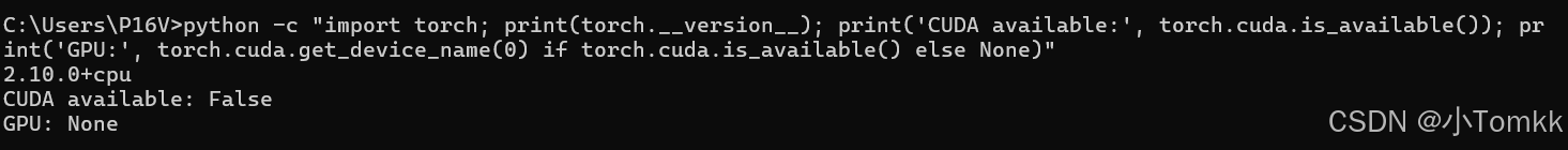 python -c "import torch; print(torch--version--); print('CUDA available:', torch.cuda.is-available()); print('GPU:', torch.cuda.get_device_name(0) if torch.cuda.is_available() else None)"