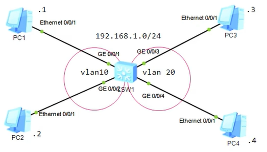 [LSW1-GigabitEthernet0/0/1]port default vlan 10 // 将接口划入VLAN 10