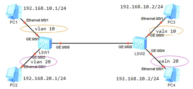 [LSW1-GigabitEthernet0/0/5]port trunk allow-pass vlan 10 20