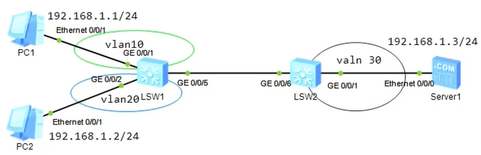 [LSW1-GigabitEthernet0/0/1]port link-type access // 设置接口为接入模式(用于连接终端/路由器)