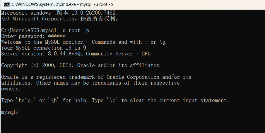 输入命令 mysql [-h 127.0.0.1] [-p 3306] -u root -p