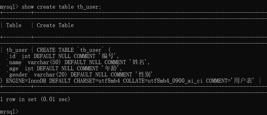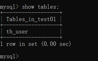 然后再去查询该数据库下的所有的表,如下图所示,test01这个数据库中现在只有一个表tb_user