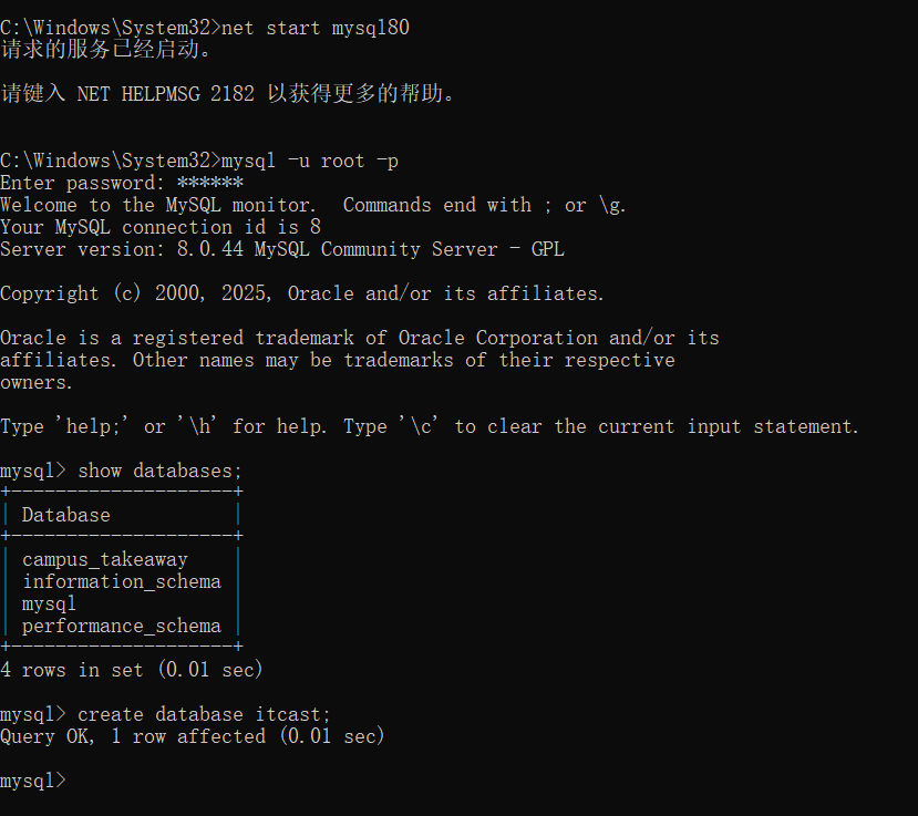 上图:首先开启mysql80,然后连接客户端,然后查询所有数据库,上图显示的有4个数据库(这4个数据库是安装时就自带的),然后创建数据库,起名为itcast,下行回复了Query OK,则说明当前数据可以创建成功!